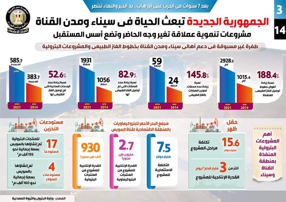 This report, which also discussed a wide variety of developments in the area since 2014, stated that the natural gas lines extending into Sinai and other cities along the Suez Canal have increased by 188.4%, providing up to 2,928 kilometers (km) of gas circulation in the relevant areas. This is considered to be a major achievement as there were only 1015.4 km of natural gas lines. Moreover, natural gas car refueling stations increased by 145.8%, to 59 stations, compared to 24 stations.